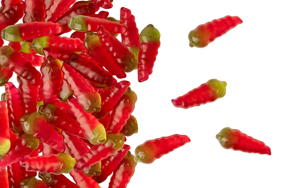Glukosesirup, Zucker, Gelatine, Säuerungsmittel: Citronensäure. Aromen, natürliches Chiliextrakt, färbende Lebensmittel: Schwarze Johannisbeere, Karotte, Saflor, Spirulina, Überzugsmittel: Bienenwachs weiß und gelb, Carnaubawachs. Kühl und trocken lagern.