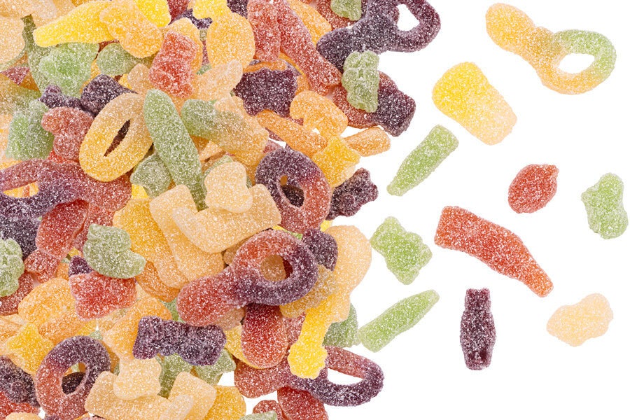 Zucker, Glukosesirup, 20% Fruchtsaft (Orange, Apfel, Ananas, Zitrone, schwarze Johannisbeere, Erdbeere) aus Fruchtsaftkonzentraten, Gelatine, Säuerungsmittel: Citronensäure, Apfelsäure, Milchsäure, Säureregulator: Calciumcitrat, Natriummalat, färbende Lebensmittel: Schwarze Johannisbeere, Karotte, Curcuma, Rettich, Saflor, Spirulina, Karamellzuckersirup. Aromen. Kühl und trocken lagern.